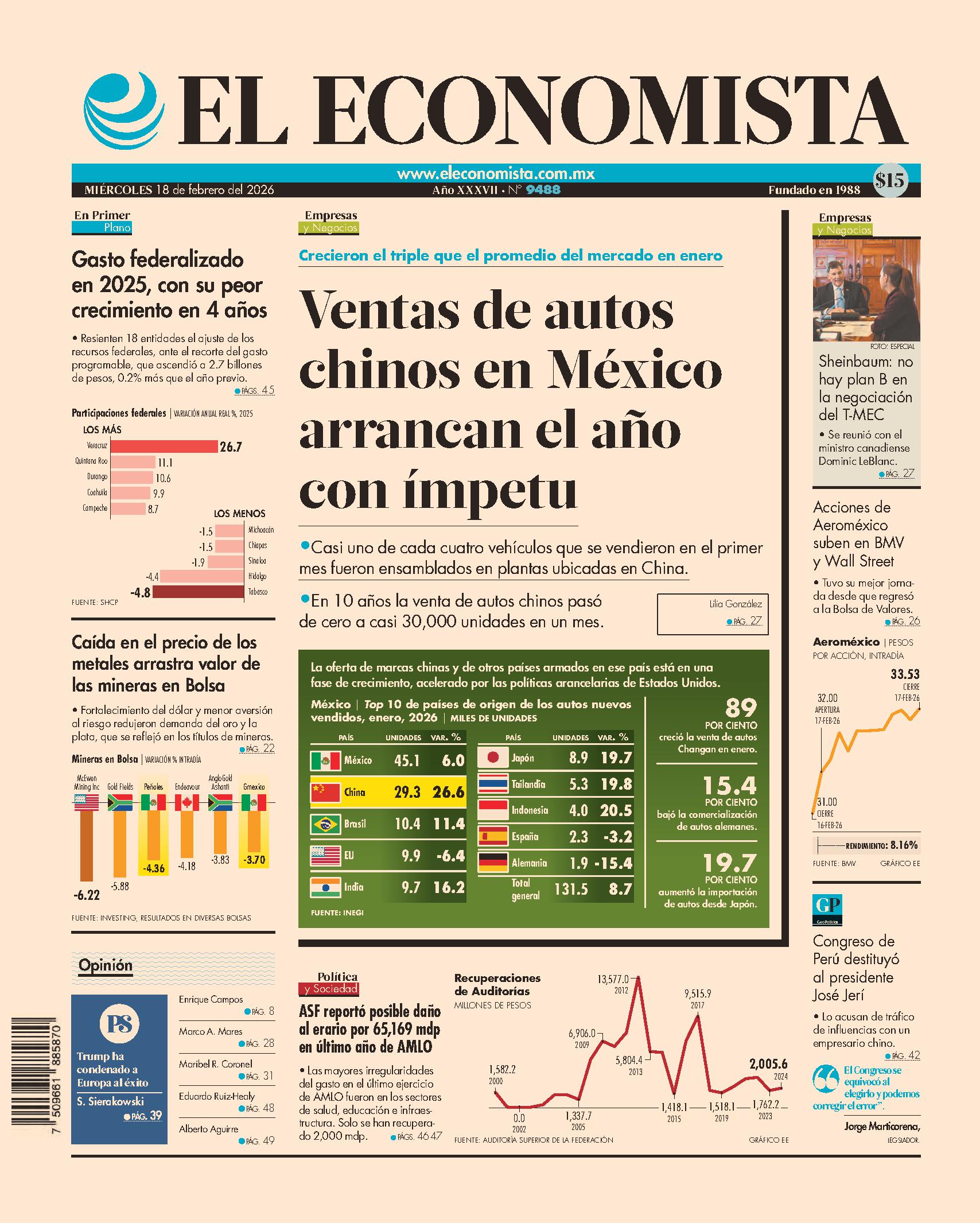A casi un año de la reforma que prohíbe la siembra de maíz transgénico, este símbolo cultural se abarató 2.7% en enero. Se trata del doceavo mes consecutivo en que disminuye de precio y la baja más profunda de los últimos 23 años, según los registros del Inegi. Nos explican que el grano entró en fase crítica debido a que Estados Unidos inundó del producto a México. La Agencia Nacional de Aduanas de México, de Rafael Marín, reporta que las compras en el extranjero se dispararon 25% y alcanzaron 1.97 millones de toneladas en enero, consolidando al país como el mayor importador del mundo. A su vez, nos platican que los productores del Bajío y Chihuahua tienen excedentes que no logran comercializar, porque el mercado está saturado de maíz sembrado en el otro lado de la frontera.