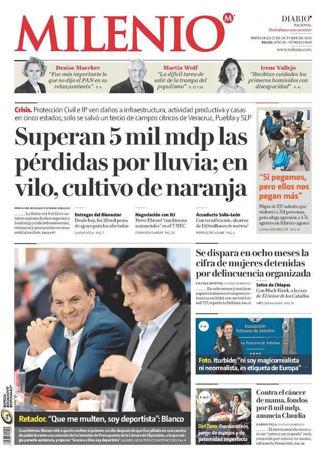 La lluvia del 9 al 12 de octubre dejó una factura económica superior a 5 mil millones de pesos y dañó infraestructura, viviendas y producción en estados clave como Veracruz, Puebla, Hidalgo, San Luis Potosí y Querétaro, estimó la Confederación de Cámaras Nacionales de Comercio, Servicios y Turismo (ConcanacoServytur) con datos de la Coordinación Nacional de Protección Civil (CNPC). De acuerdo con este organismo federal, las precipitaciones generaron inundaciones severas, deslaves y desbordamientos de los ríos Cazones, Papaloapan y Jalpan. De acuerdo con el gobierno federal, entre el 7 y el 11 de octubre estas lluvias extraordinarias provocaron que esté comprometido aproximadamente 68.8 por ciento del cultivo de naranja a escala nacional, lo que equivale a 3 millones 328 mil 113 toneladas de esta fruta, principalmente en Veracruz, San Luis Potosí y Puebla. Cifras oficiales de la Secretaría de Agricultura y Desarrollo Rural (Sader) y de la Dirección General del Servicio de Información Agroalimentaria y Pesquera señalan que los principales productores de naranja se encuentran en estas entidades.