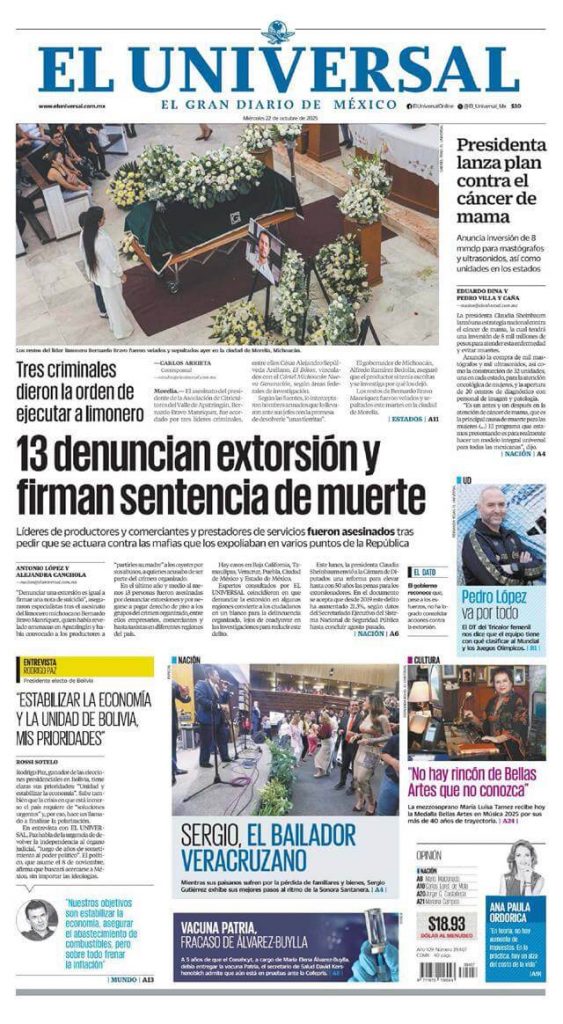 El Consejo Nacional Agropecuario (CNA) condenó el homicidio de Bernardo Bravo Manríquez, a quien calificó como un “defensor inalcanzable de los derechos de los agricultores en México”. En un comunicado, la organización advirtió que la violencia en el campo es ya una amenaza para la seguridad alimentaria del país. El Consejo alertó que las extorsiones a productores han encarecido los alimentos, estimando que entre 10 y 20% del costo de varios productos agroalimentarios corresponde a pagos exigidos por grupos criminales.