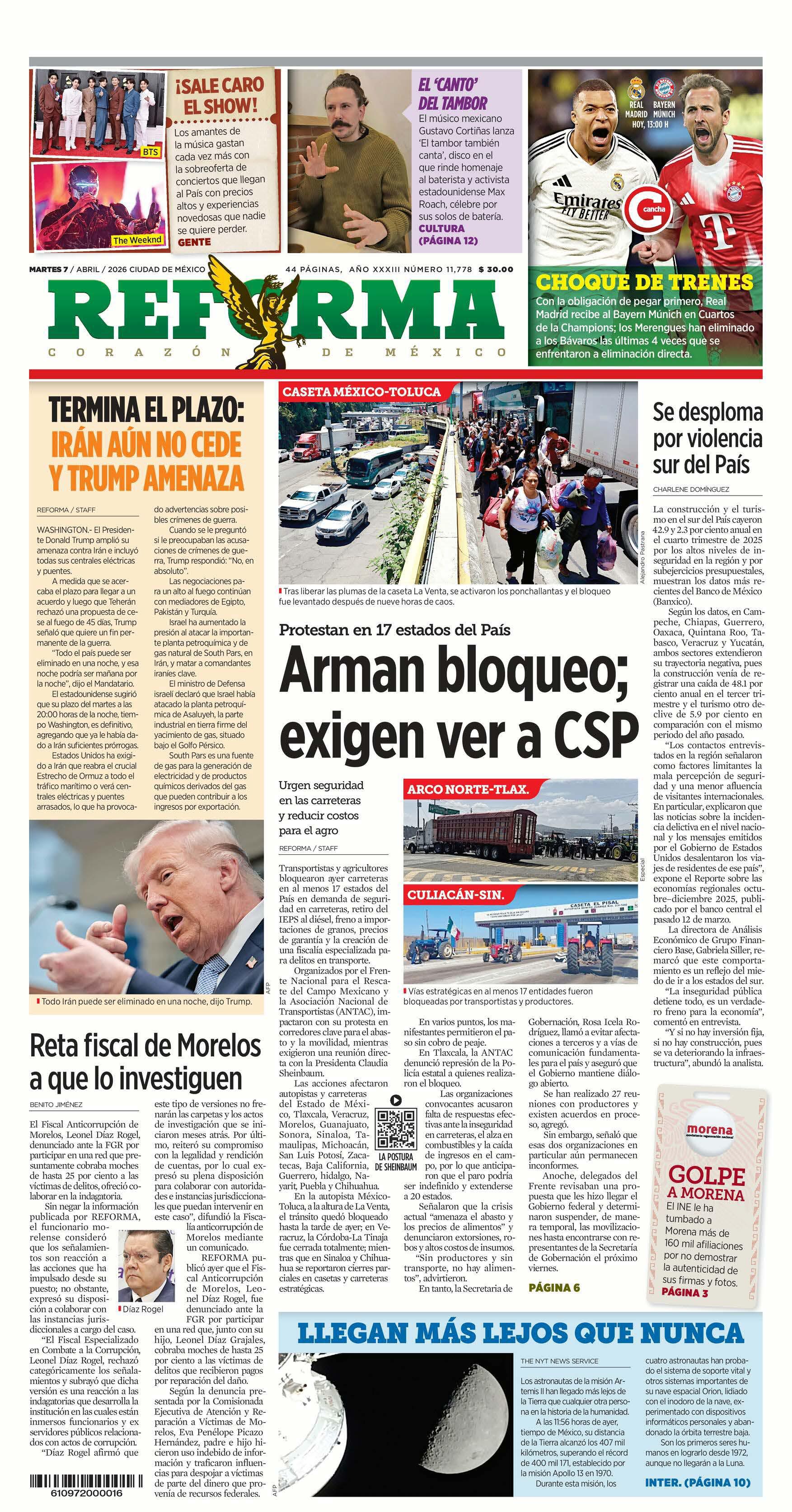 Con tractocamiones y tráileres, se realizaron bloqueos carreteros ayer y se dio paso libre de vehículos en casetas de peaje en al menos 13 entidades, como parte del paro nacional indefinido de agroproductores y transportistas. Las manifestaciones se reportaron en Zacatecas, Chihuahua, Sinaloa, Estado de México, Michoacán, Baja California, Tamaulipas, Nayarit, San Luis Potosí, Guanajuato, Tlaxcala, Morelos y Veracruz. Integrantes del Frente Nacional por el Rescate del Campo Mexicano (FNRCM) y la Asociación Nacional de Transportistas en México (Antac) explicaron que esta movilización surge ante la falta de soluciones “reales, efectivas y permanentes” a los problemas que enfrentan. Reiteraron entre sus exigencias ocho urgentes: seguridad en carreteras, reducción en el costo de combustibles, eliminación de abusos y extorsiones, tarifas justas en el transporte, apoyo real al campo mexicano, infraestructura carretera digna, fin a la criminalización del transporte y del campo, y mesas de diálogo serias, con soluciones concretas y compromisos verificables.